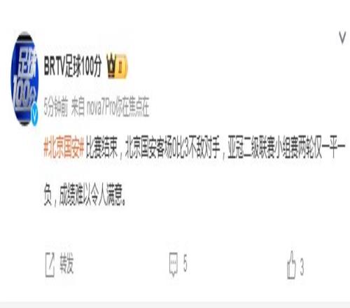 而北京媒体《足球100分》栏目,也直言不讳指出球队表现无法令人满意,“比赛结束,北京国安客场0比3不敌对手,亚冠二级联赛小组赛两轮仅一平一负,成绩难以令人满意。 ”