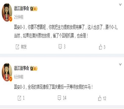 媒体人徐江用一个形象的比喻来点评这场比赛,“国安0-3,全场的表现像极了国庆最后一天等待放假的牛马!你要不想赢呢,你就把主力提前放假完事了,这人也去了,踢个0-3。当然,如果在澳洲原地放假,省了个回程机票,也合理! ”