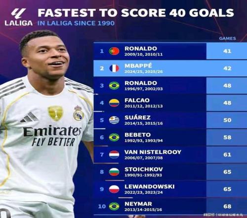 10月8日,当足球世界的目光仍聚焦于姆巴佩在皇家马德里的融入与表现时,一份来自德国转会市场(德转)的权威统计,为这位法国巨星的首个西甲赛季写下了浓墨重彩的一笔。数据显示,姆巴佩仅用42场比赛便攻入40粒西甲进球,这一效率高居自1990年以来西甲历史第二位,仅次于传奇前锋C罗的41场,甚至超越了“外星人”罗纳尔多。这不仅仅是一个冰冷的数字,它宣告着一位新的王者正在伯纳乌的星空下冉冉升起。
