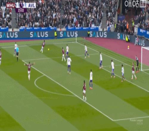 第24分钟,波茨助攻,鲍恩门前点射破门,西汉姆联2-1维拉