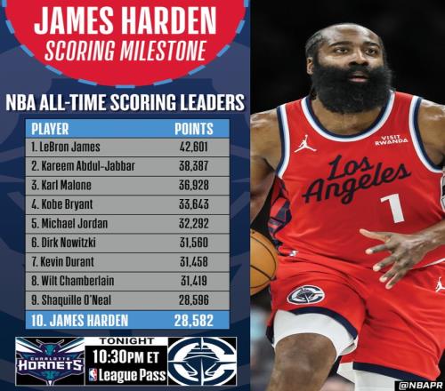 北京时间1月13日,快船对阵黄蜂,哈登常规赛生涯总分超过奥尼尔(28596分),升至NBA历史得分榜第9位,继续书写他作为联...